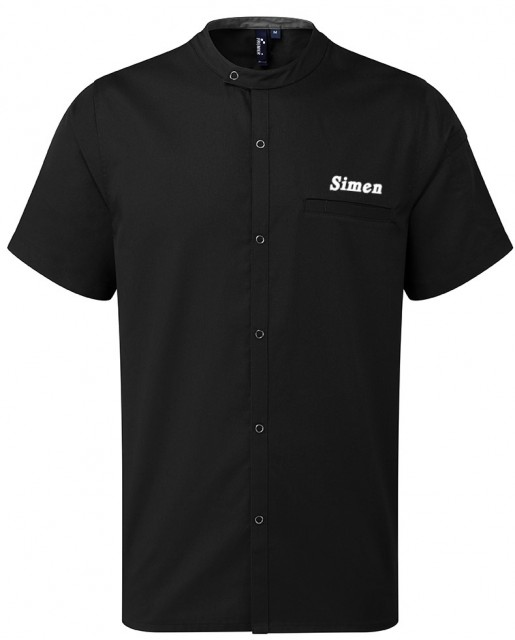 Asymmetrisk mandarinkrage med knapper foran for enkel bruk.