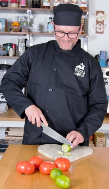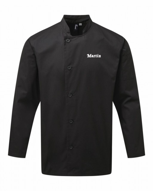 En slitesterk langermet kokkejakke med knappefeste på høyre side.