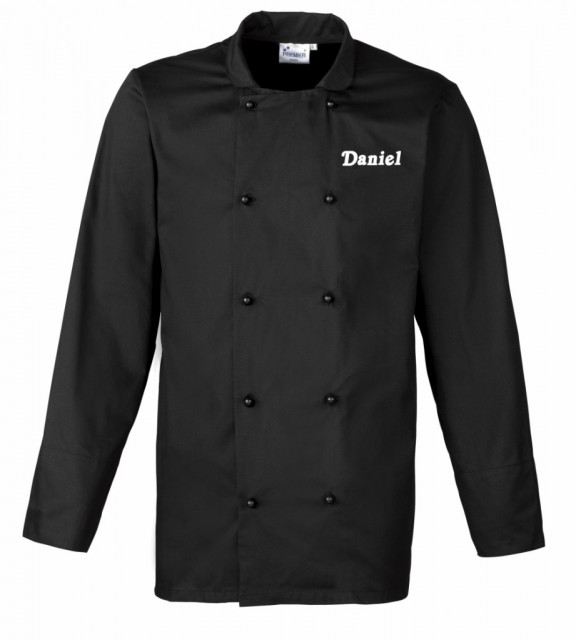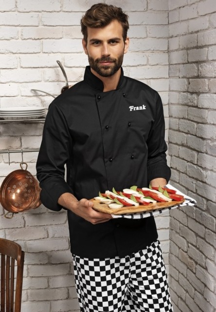 Klassisk unisex kokkejakke med sorte knapper i plast som enkelt kan kombineres med andre knappefarger.